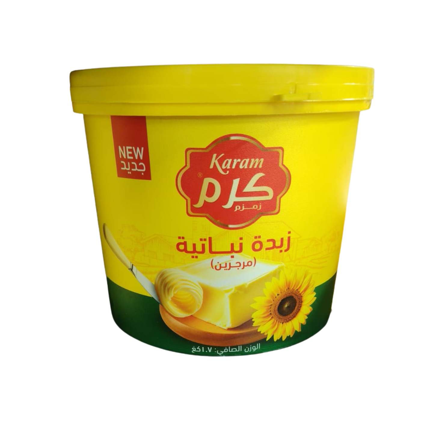 سمنة كرم النباتية (مرجرين) من إنتاج شركة زمزم، ويظهر في الصورة حجم 1.7 كجم.