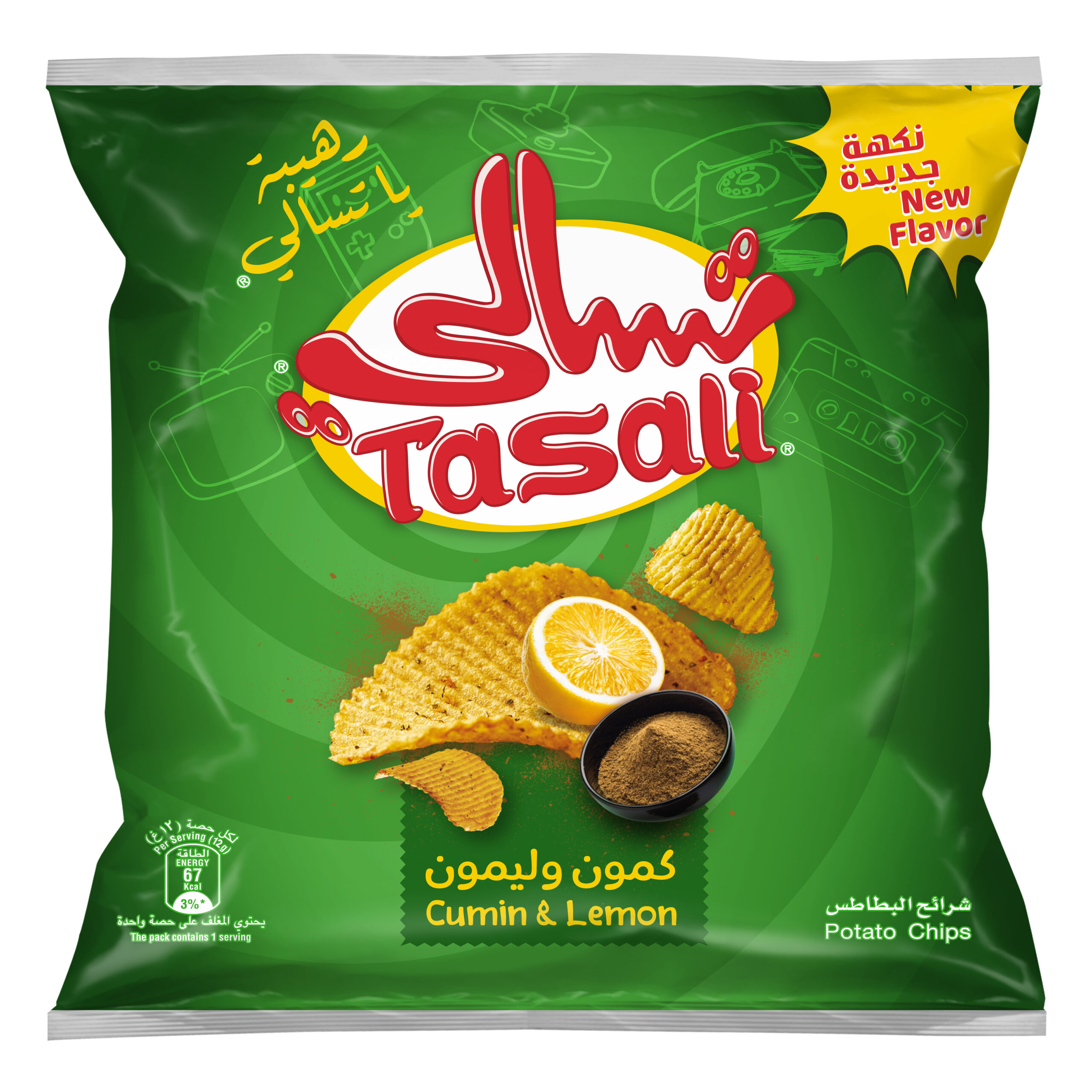 رقائق بطاطس تسالي بنكهة الكمون والليمون.