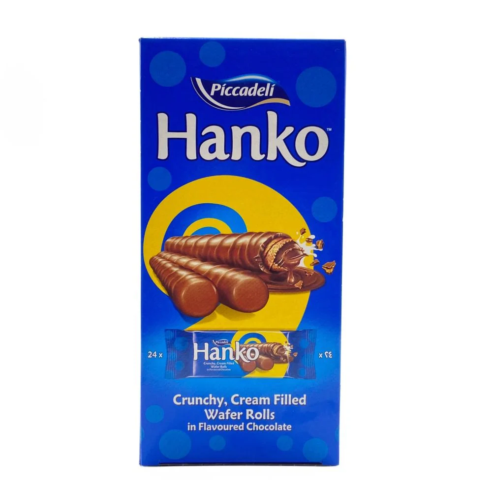 - المنتج: هانكو (Hanko) لفافات ويفر مقرمشة محشوة بالكريمة بنكهة الشوكولاتة.